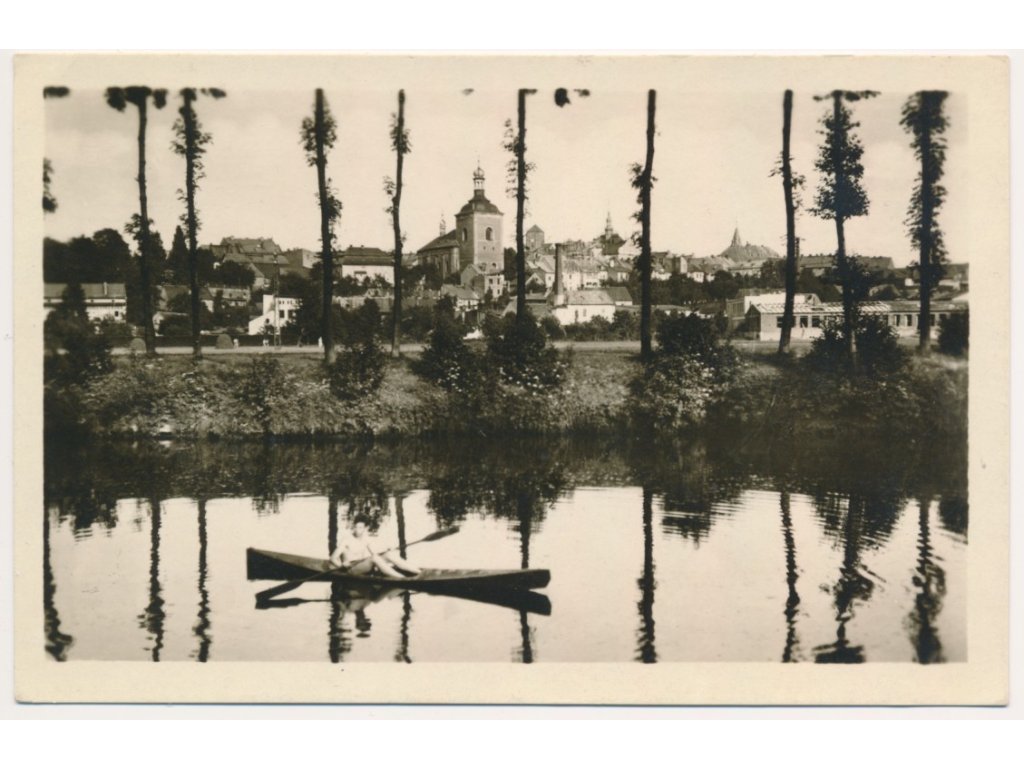 58 - Semilsko, Turnov, oživený pohled na město s kajakářem, cca 1951