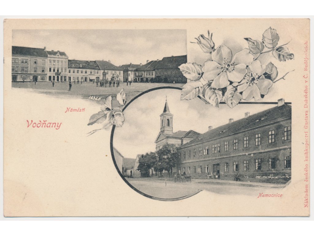60 - Strakonicko, Vodňany, 2 záběrová koláž oživených partií, mj. Nemocnice, cca 1900