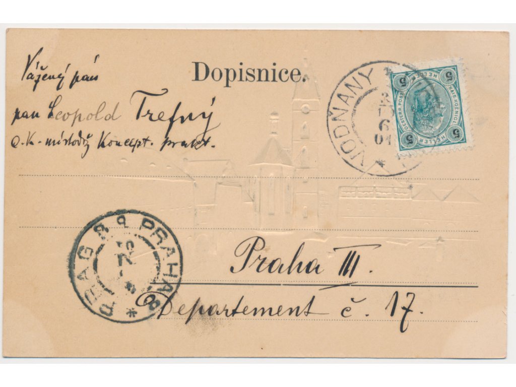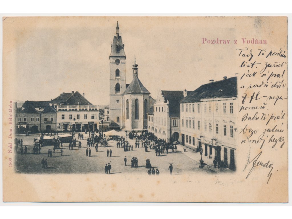 60 - Strakonicko, Vodňany, Reliéfní pohlednice, pohled na oživené náměstí, cca 1901