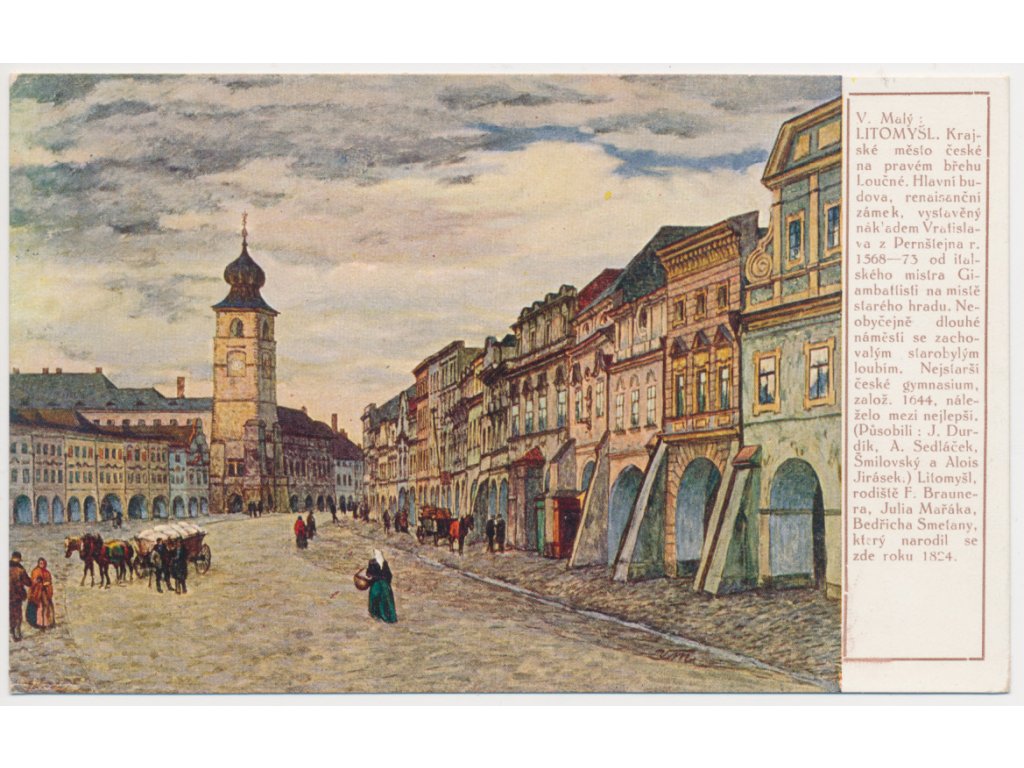61 - Svitavsko, Litomyšl, oživené náměstí s podloubím, akad. malíř V. Malý, cca 1925