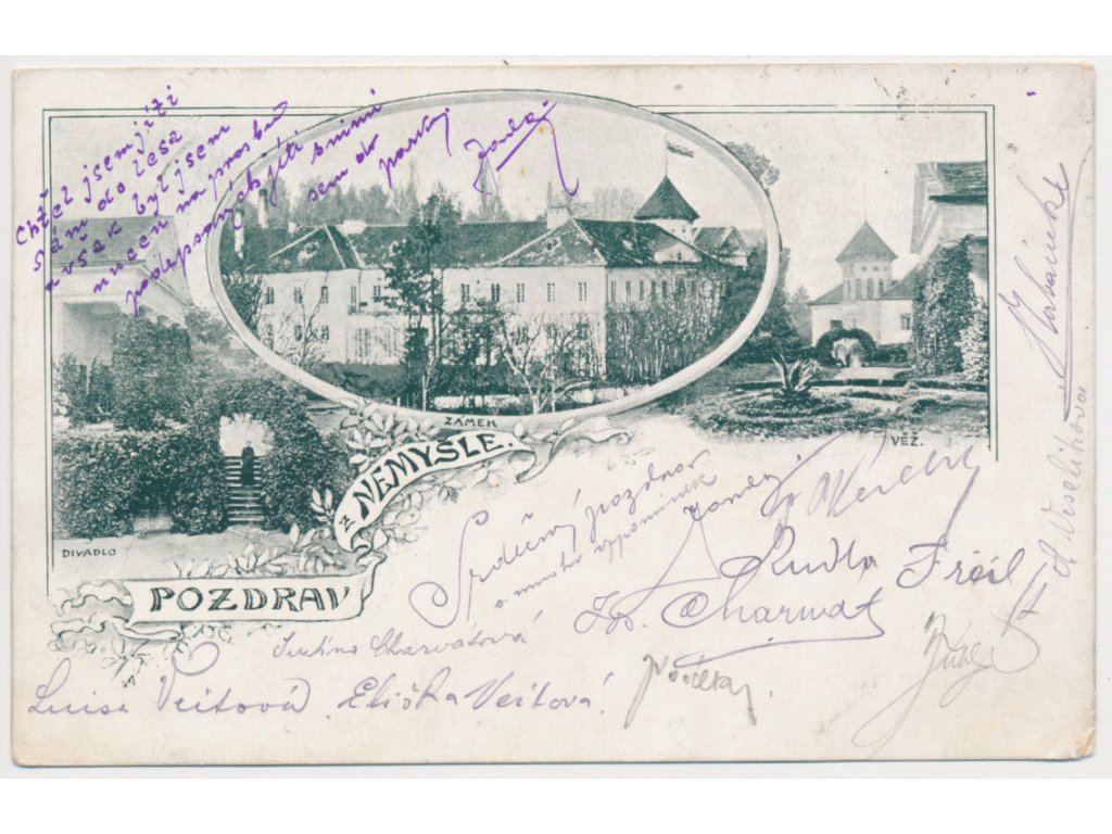 64 - Táborsko, Nemyšl, 3 záběrová koláž, zámek, divadlo, věž, cca 1904