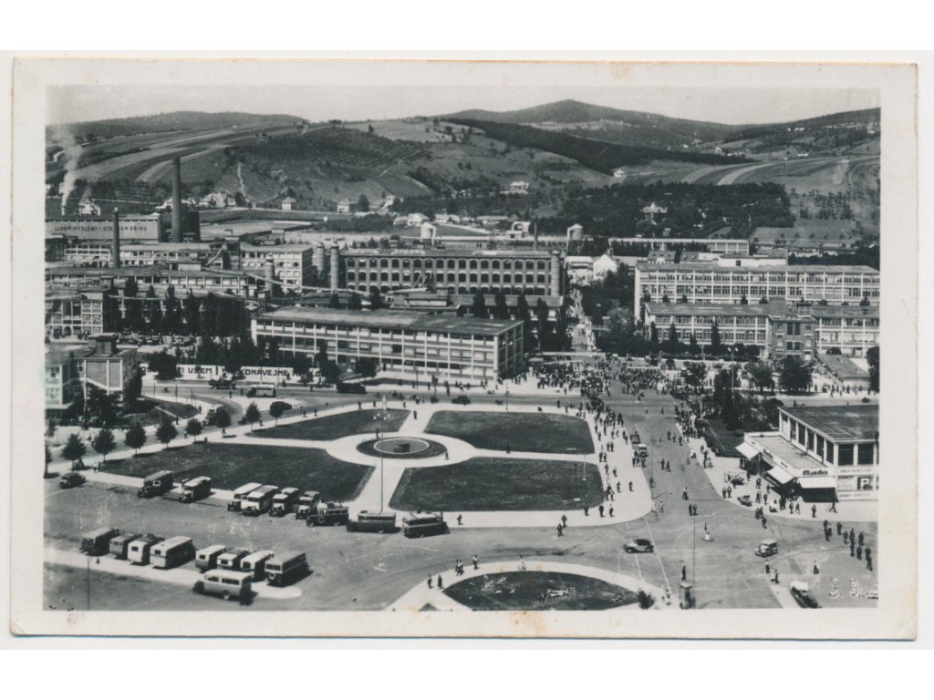 73 - Zlín, Náměstí Práce, lidé, autobusy..., cca 1938