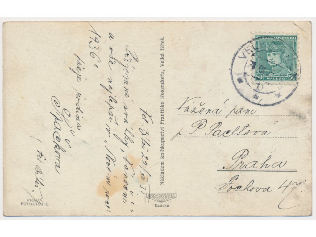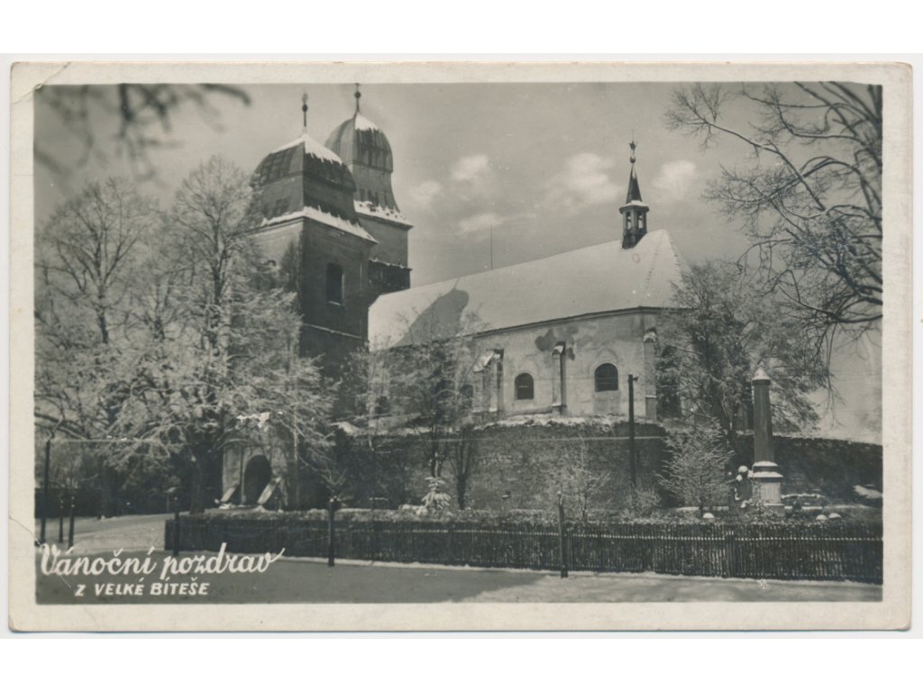 75 - Žďársko, Velká Bíteš, Vánoční pozdrav, partie s kostelem, cca 1935