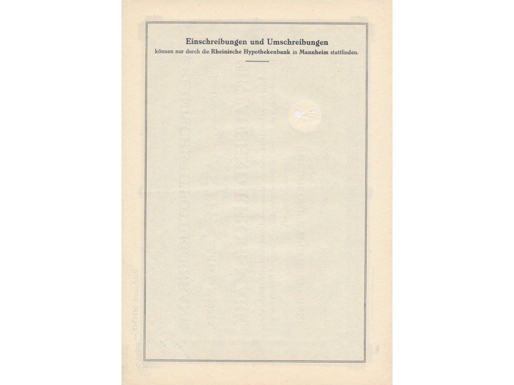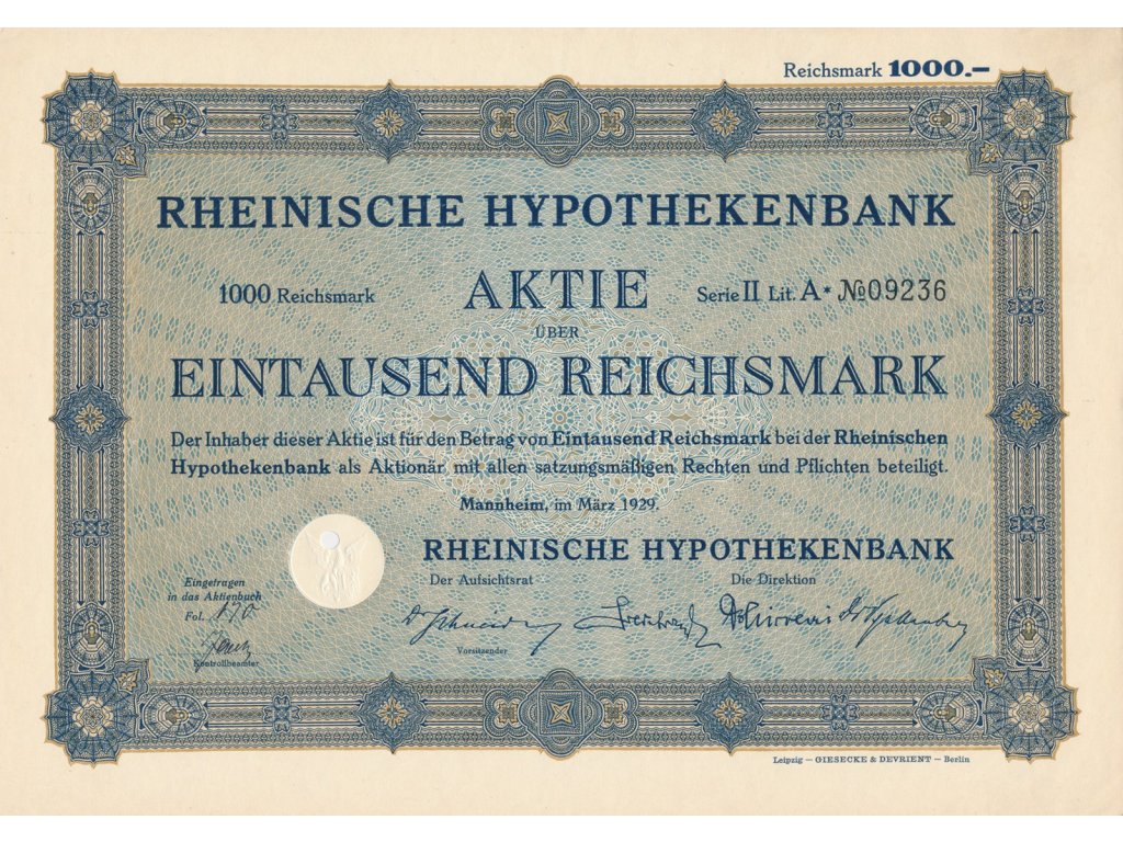 Akcie na doručitele, Rheinische Hypotekenbank, 1000 Reichsmark, 1929, rozměr cca A4 (210x300 mm), krásná sběratelská jakost...viz autentické foto