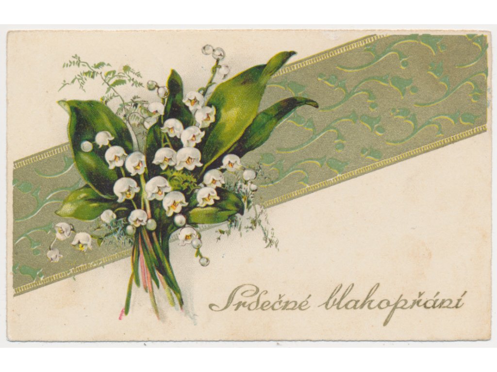 Blahopřejná pohlednice, Srdečné přání s konvalinkami, cca 1935