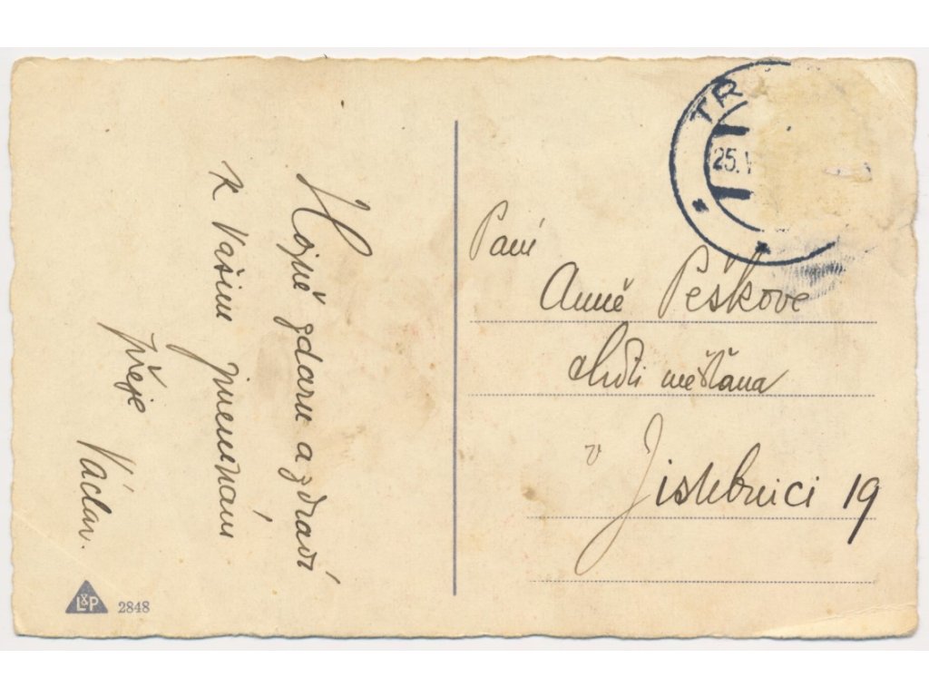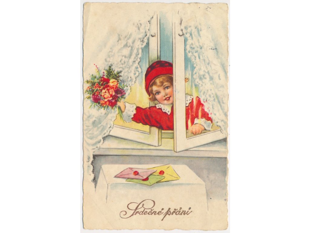 Blahopřejná pohlednice, "Srdečné přání", holčička s květinou v okně, ca 1935