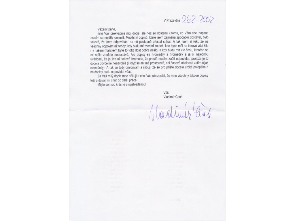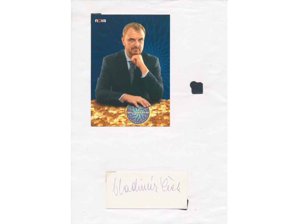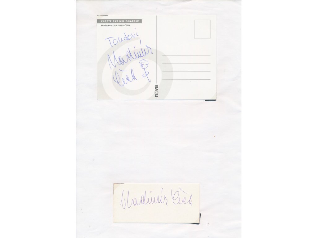 Čech Vladimír (1951-2013), český moderátor a dabér, sběratelský list o velikosti A4 s portrétovou propagační kartou s vl. podpisem a s vlastnoručním podpisem na sběratelské kartičce + přiložen dopis (datováno 2002)...viz autentické foto