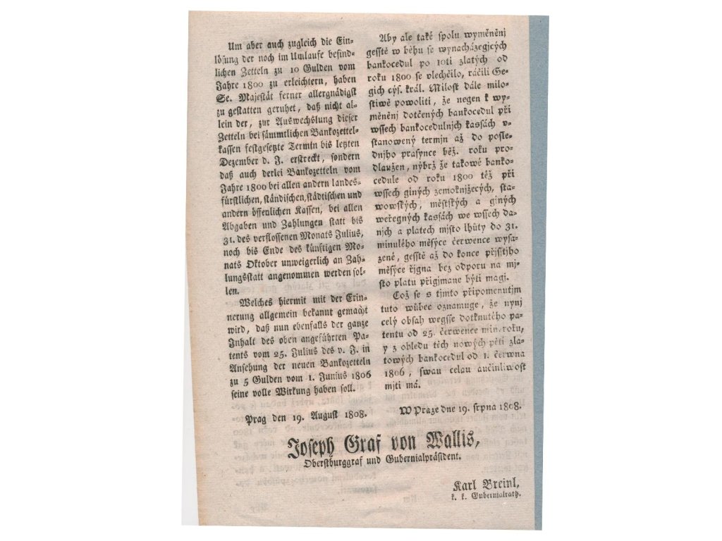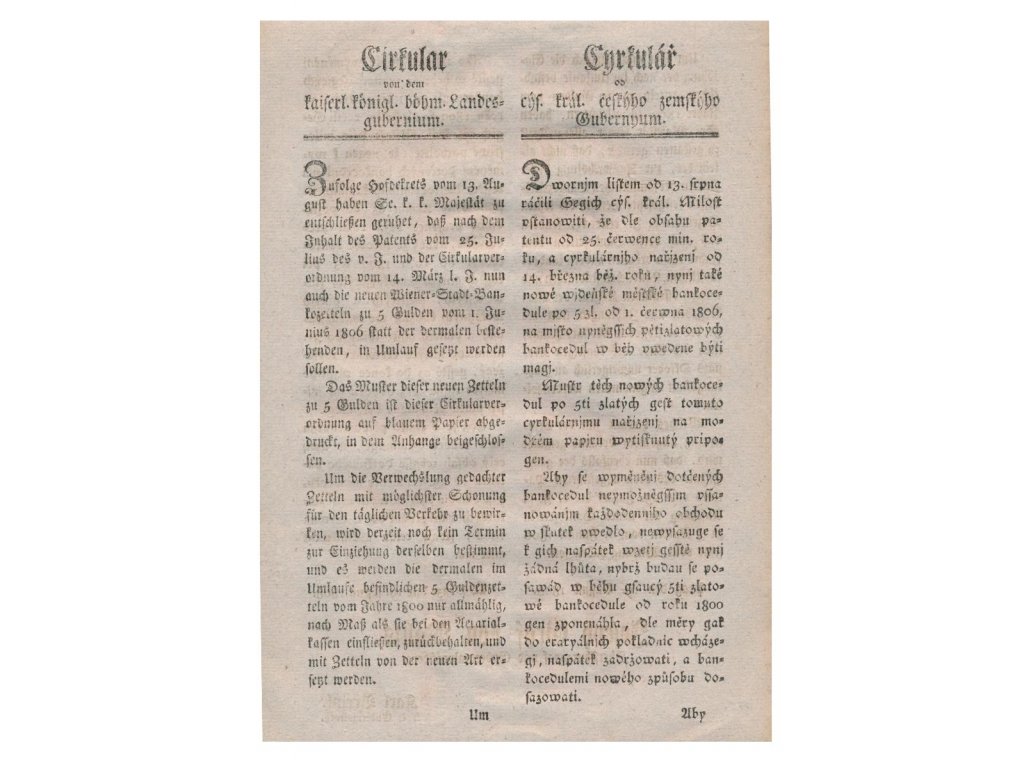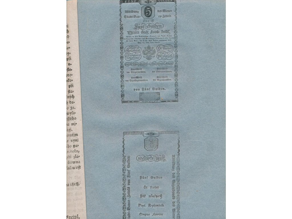 České gubernium, nařízení o uvedení do oběhu nových vídeňských bankocetlí po 5 Zlatých na místo nynějších. Pro výměnu bankocetlí nebyla stanovena nijaká časová lhůta. - z oběhu se budou stahovat a nahrazovat novými postupně. Vzor nové bankocetle je přiložen k nařízení, 1808, ojedinělý výskyt, možnost zajistit certifikát pravosti, doživotní záruka pravosti - viz autentické foto