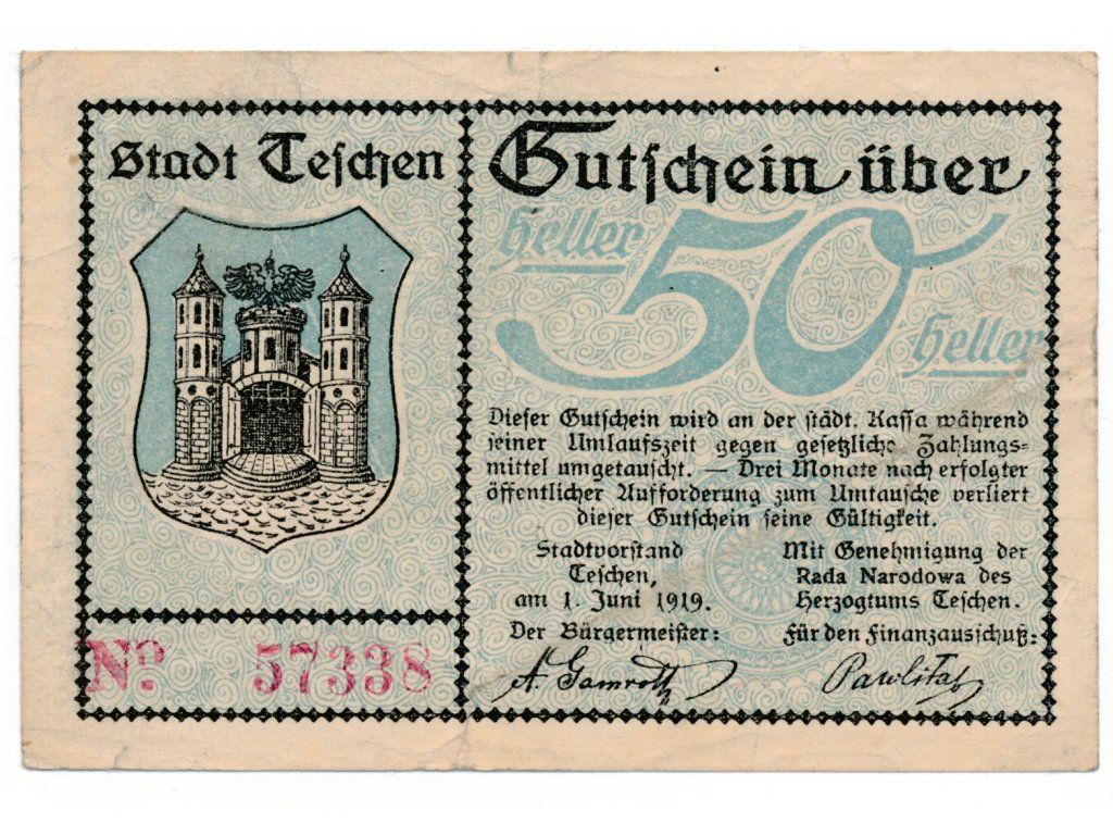 Český Těšín (Ciezsyn), 50 Haléř, 1919, Nr. 57338, oběhová jakost