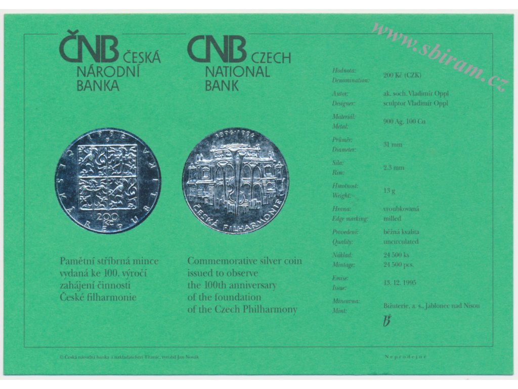 ČR, certifikát k Ag minci 200,-Kč, 1995, Česká filharmonie