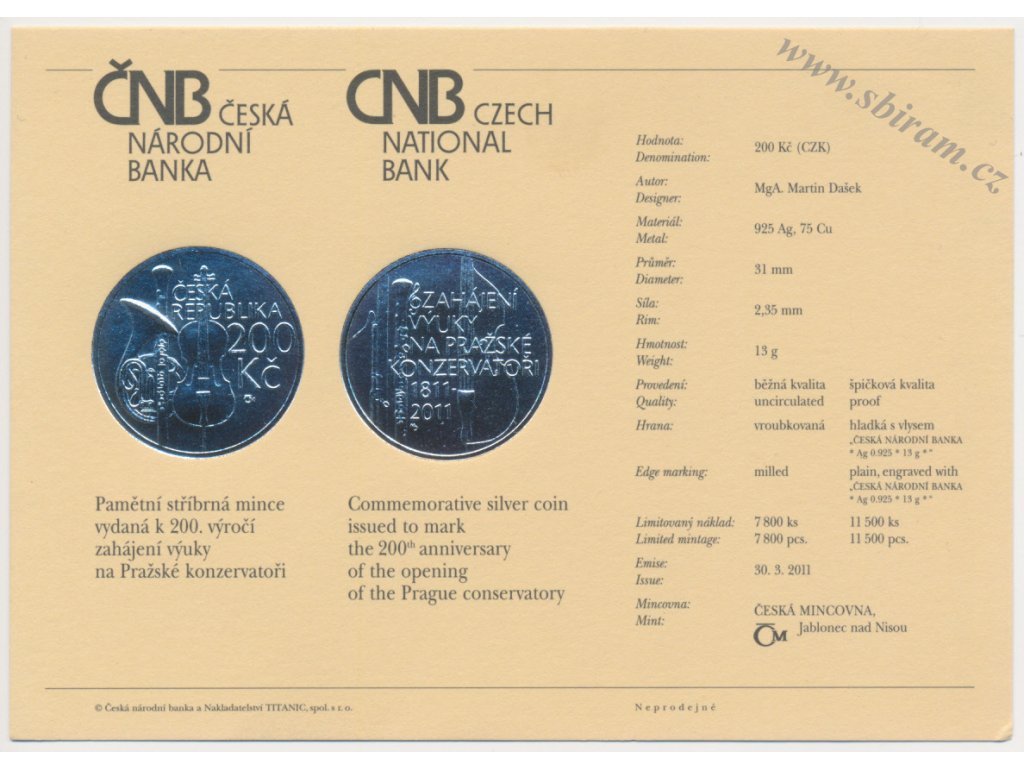 ČR, certifikát ke stříbrné pamětní minci 200,-Kč, 2011, 200. výročí zahájení výuky na Pražské konzervatoři, luxusní sběratelská jakost...viz ilustrační foto