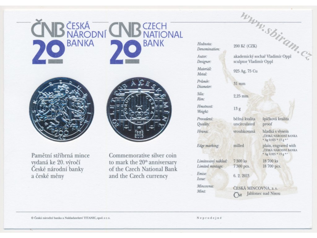 ČR, certifikát ke stříbrné pamětní minci 200,-Kč, 2013, 20. výročí ČNB a české měny, luxusní sběratelská jakost...viz ilustrační foto