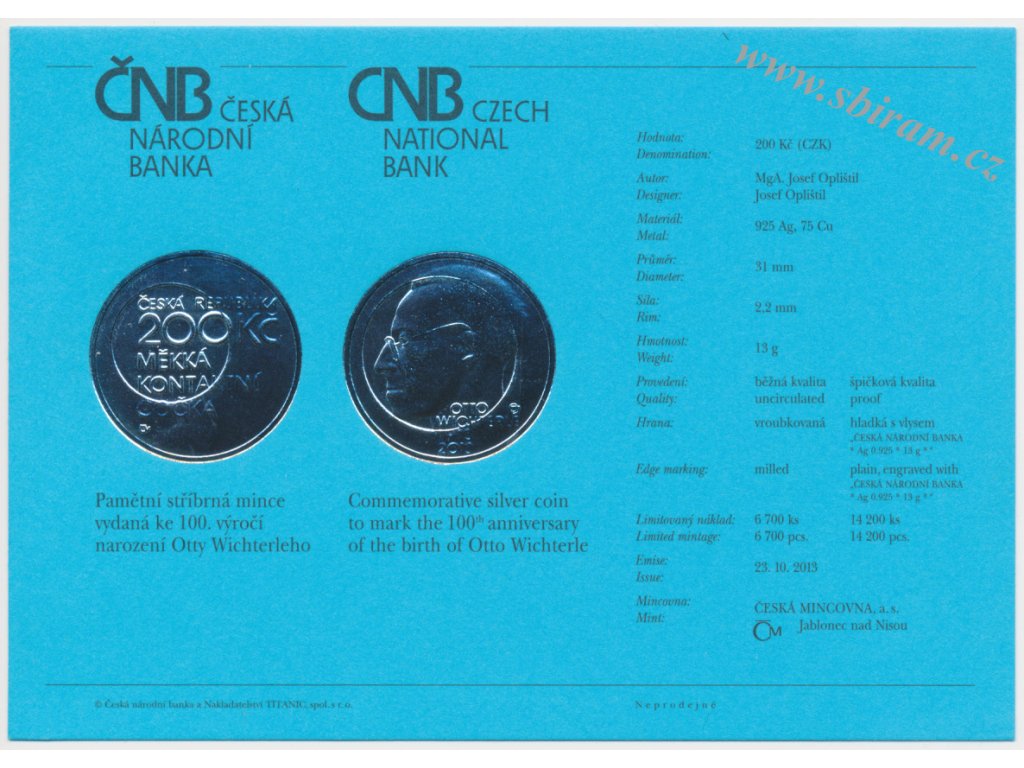 ČR, certifikát k Ag minci 200,-Kč, 2013, Otto Wichterle