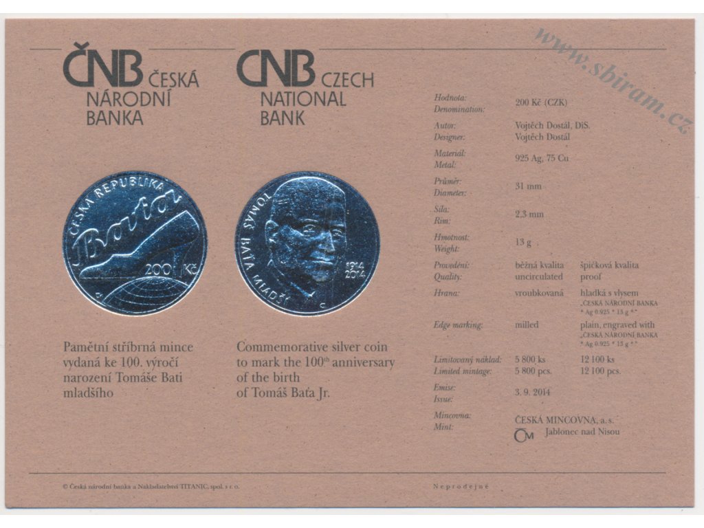 ČR, certifikát ke stříbrné pamětní minci 200,-Kč, 2014, 100. výročí narození Tomáše Bati ml., luxusní sběratelská jakost...viz ilustrační foto
