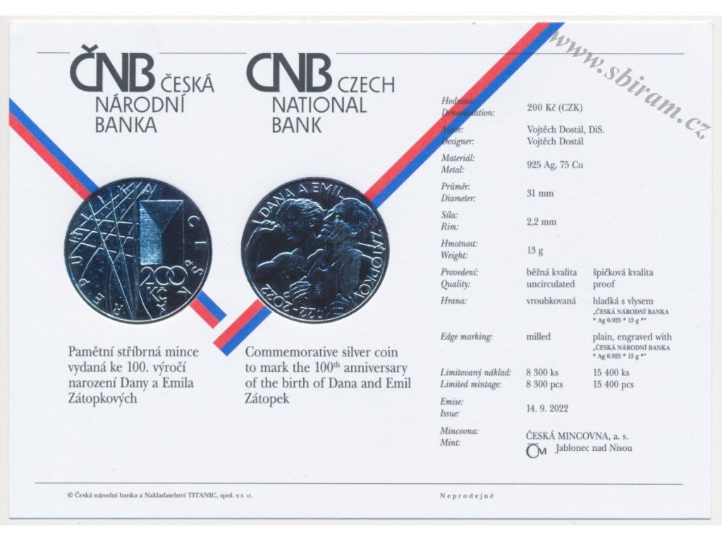 ČR, certifikát ke stříbrné pamětní minci 200,-Kč, 2022, 200. výročí narození D. a E. Zátopkových, luxusní sběratelská jakost...viz ilustrační foto
