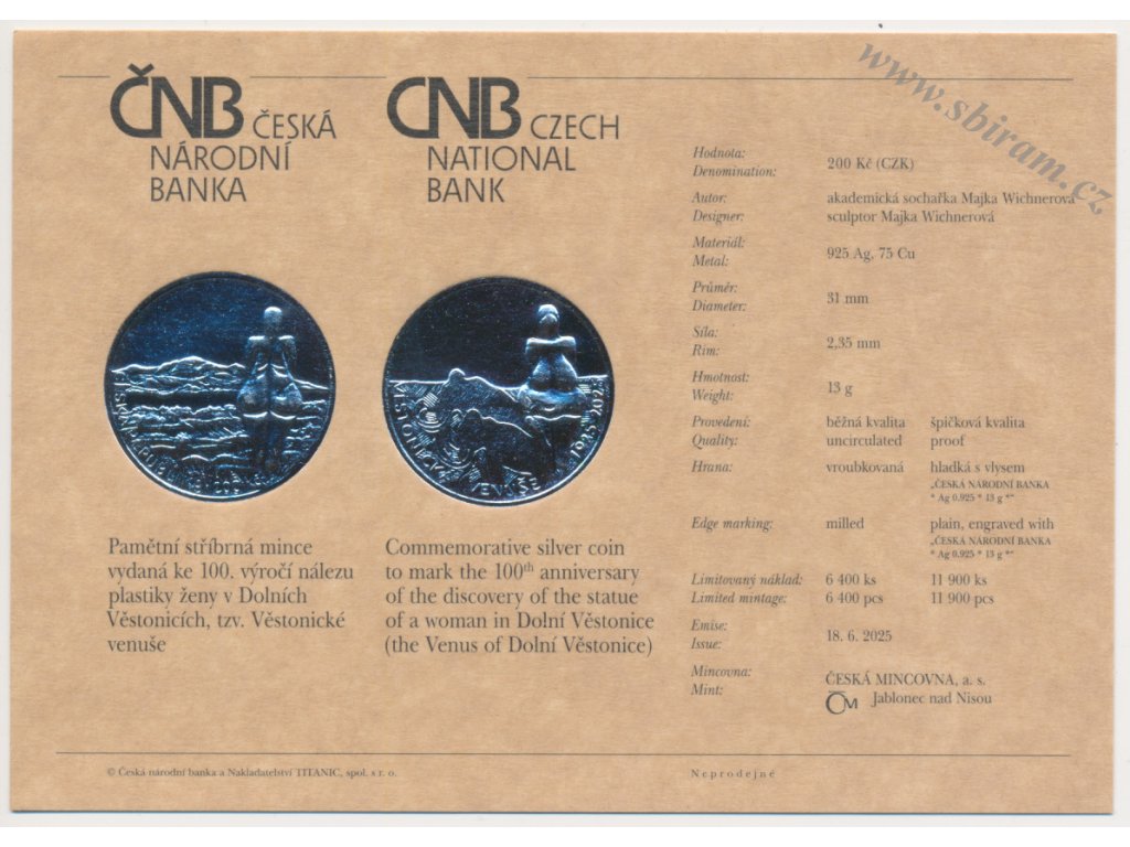 ČR, certifikát k Ag minci 200,-Kč, 2025, 100. výročí nálezu Věstonické venuše