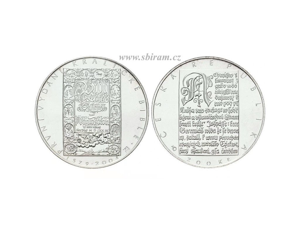 ČR, Ag (stříbrná) mince 200 Koruna 2004 - 425. výročí prvního vydání Bible Kralické, jemná patina, ražební lesk, stav 0/0...viz foto