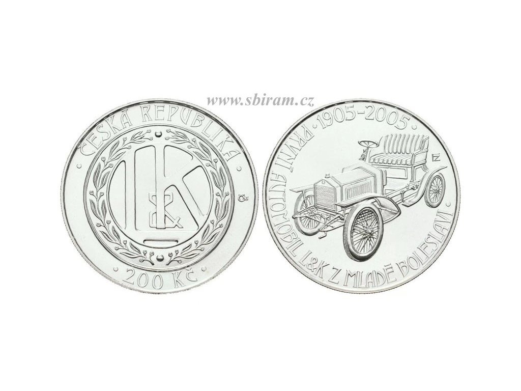 ČR, Ag (stříbrná) mince 200 Koruna 2005 - 100. výročí zahájení výroby prvního automobilu Laurin & Klement v Mladé Boleslavi, ražební lesk, stav 0/0...viz foto