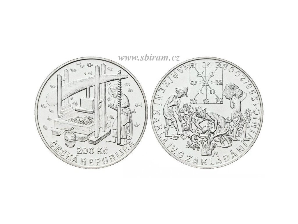 ČR, Ag (stříbrná) mince 200 Koruna 2008 - 650. výročí vydání nařízení Karla IV. o zakládání vinic, ražební lesk, stav 0/0...viz foto