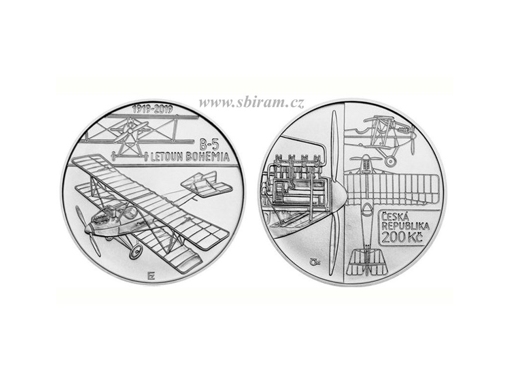 ČR, Ag (stříbrná) mince 200 Koruna 2019 - 100. výročí sestrojení prvního letounu československé výroby Bohemia B-5, ražební lesk, kapsle, stav 0/0...viz foto
