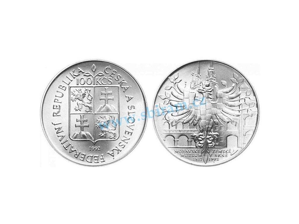 ČSFR, 100 Kčs, Moravské muzeum, 1992, Ag (stříbrná) mince, stav -0/0-