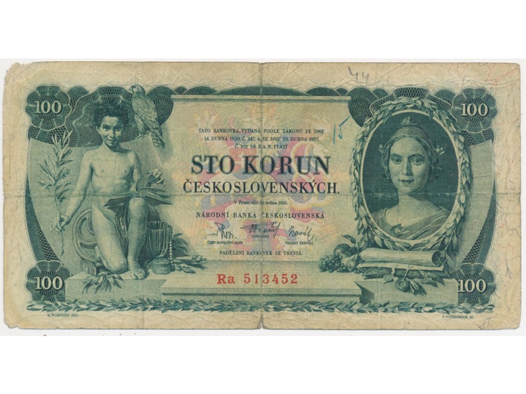 ČSR, 100 Kč, 1931, série Ra, neperforovaná, oběhový stav