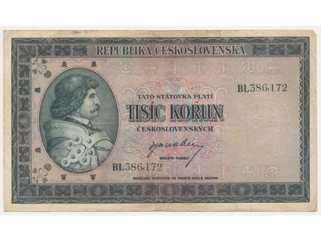 ČSR, 1000 Kčs, bez data (1945), série BL, neperforovaná, pěkný oběhový stav