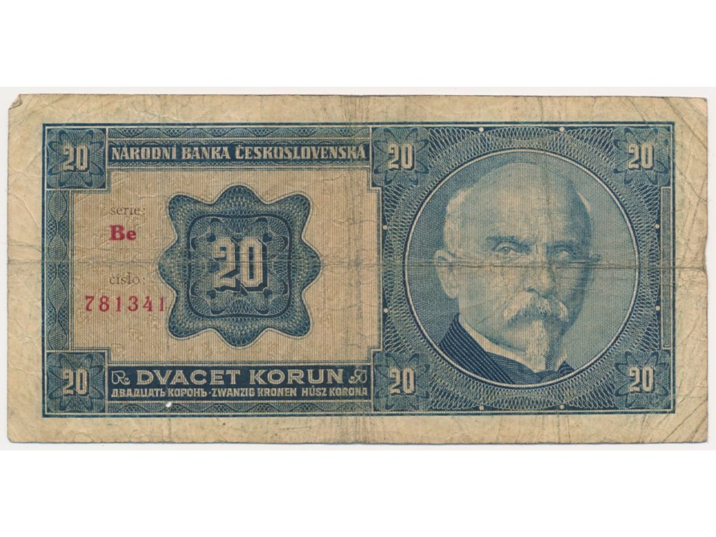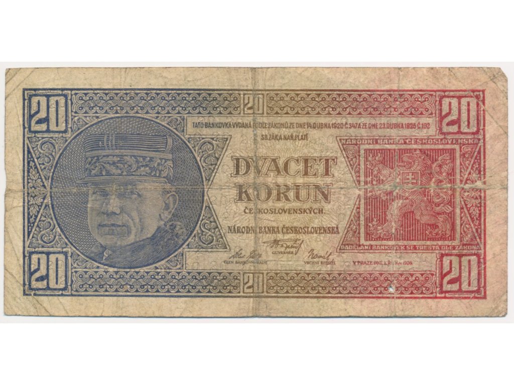 ČSR, 20 Kč, 1926, série Be, neperforovaná, oběhový stav