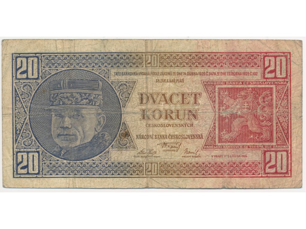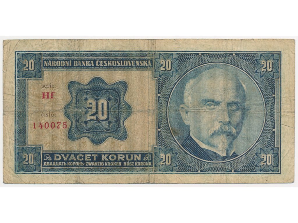 ČSR, 20 Kč, 1926, série Hf, neperforovaná, oběhový stav