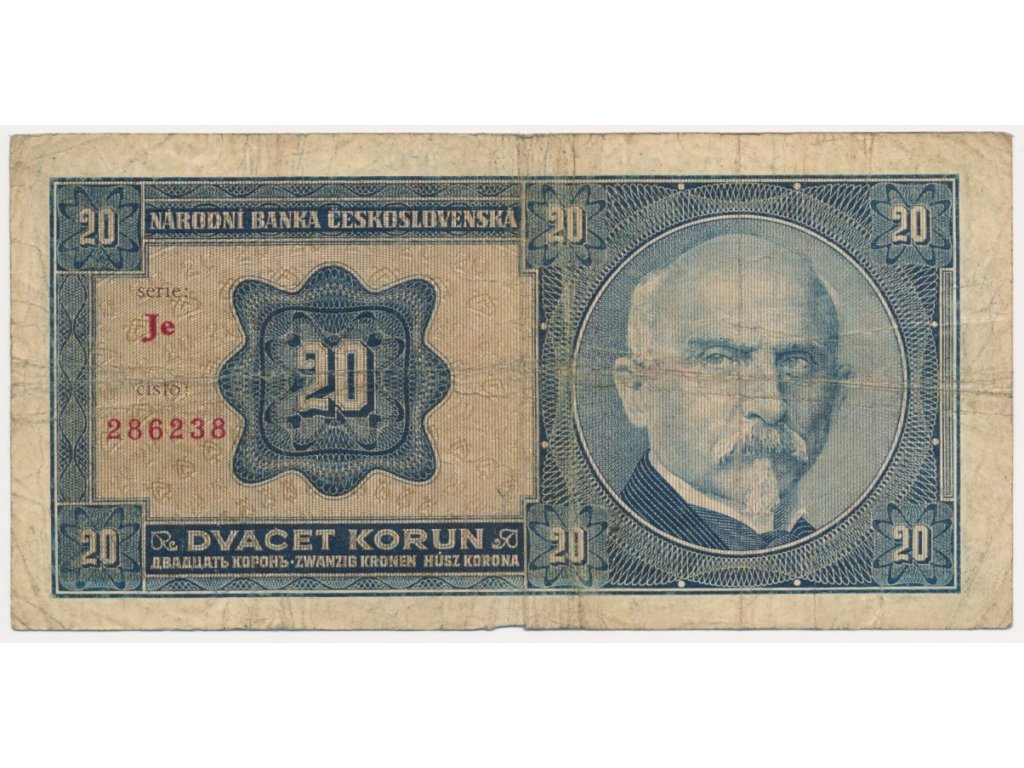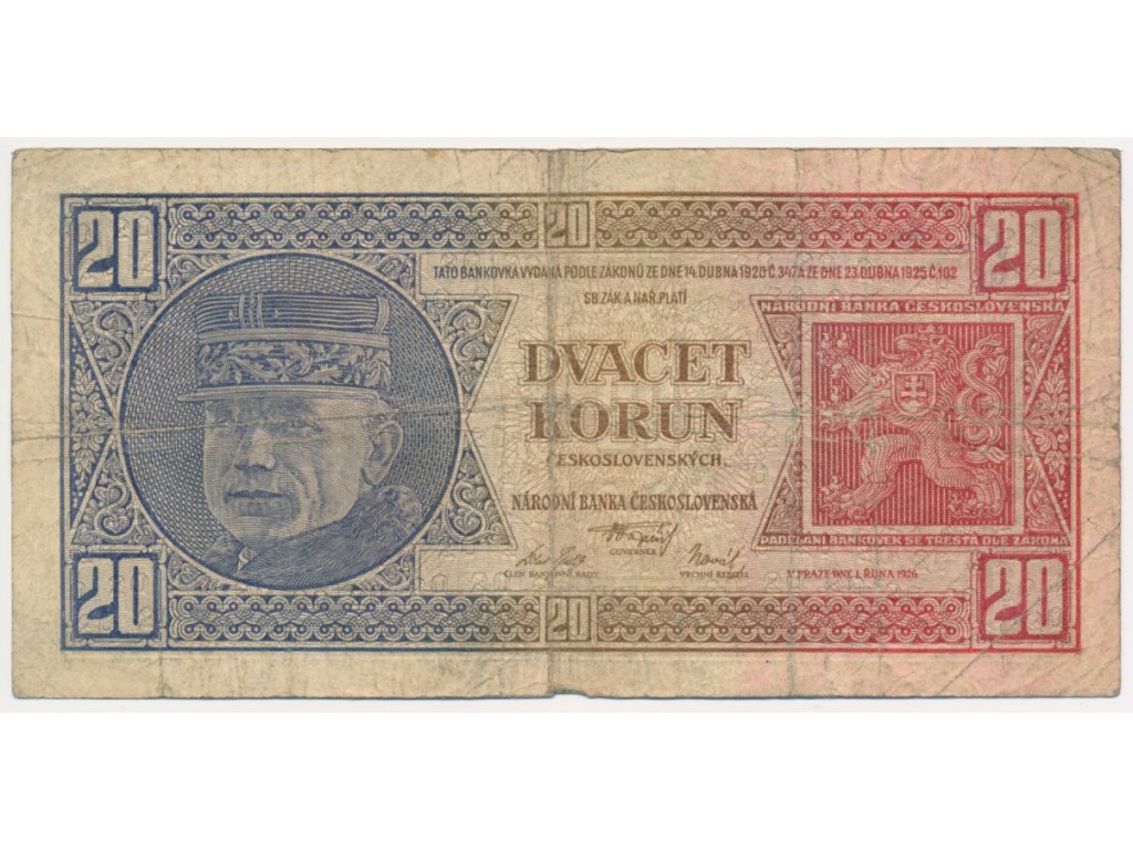 ČSR, 20 Kč, 1926, série Je, neperforovaná, oběhový stav