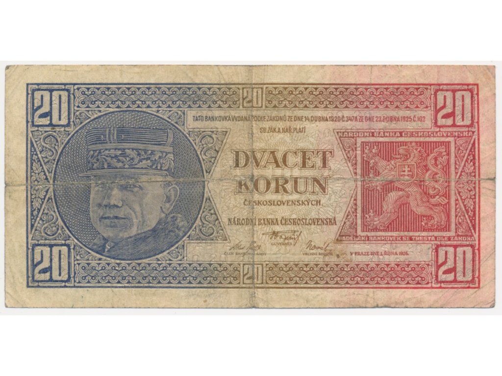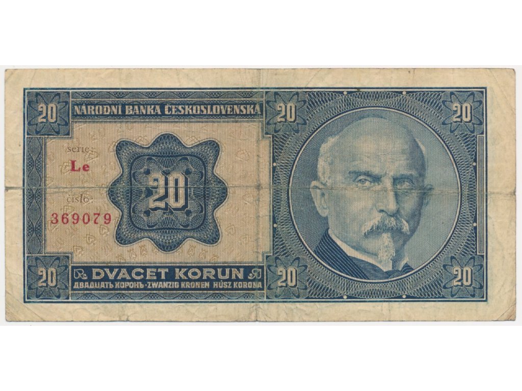 ČSR, 20 Kč, 1926, série Le, neperforovaná, oběhový stav