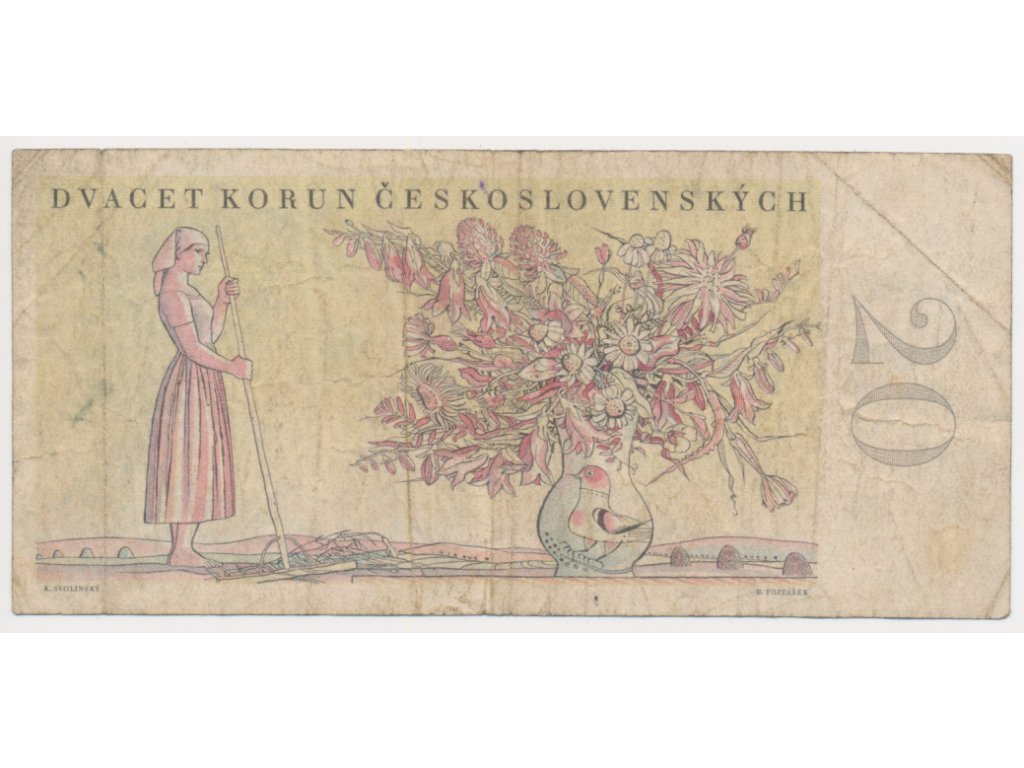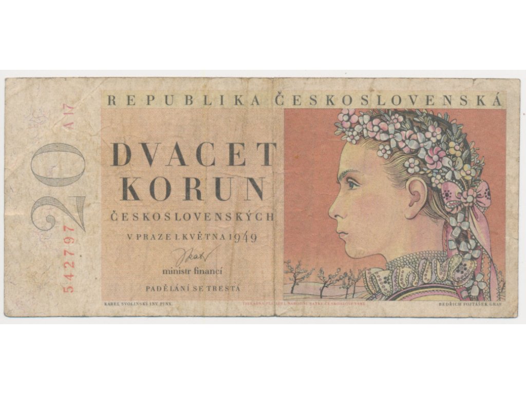 ČSR, 20 Kčs, 1949, série A17, neperforovaná, oběhový stav