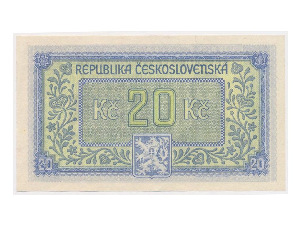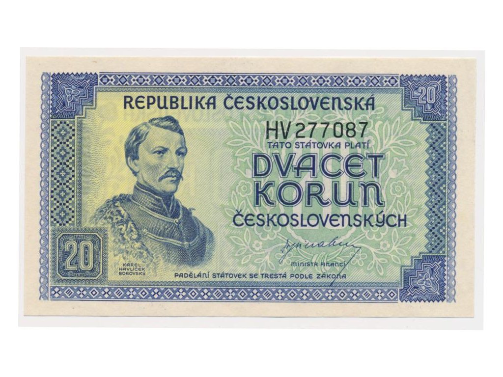 ČSR, 20 Kčs, bez data (1945), série HV, neperforovaná, krásný stav 0++