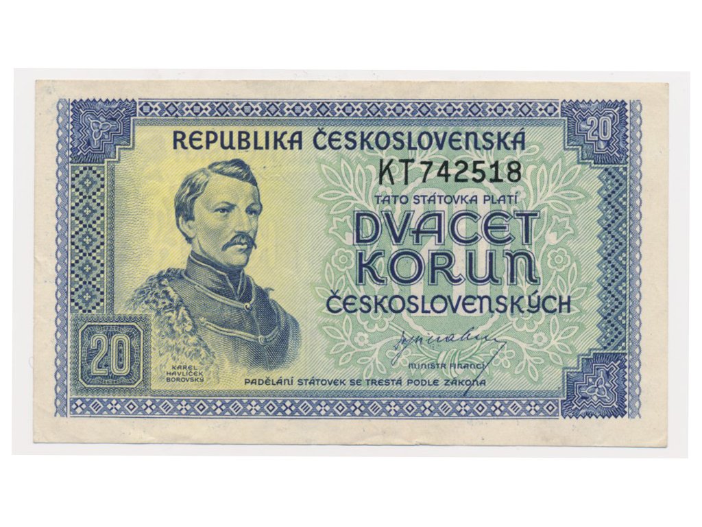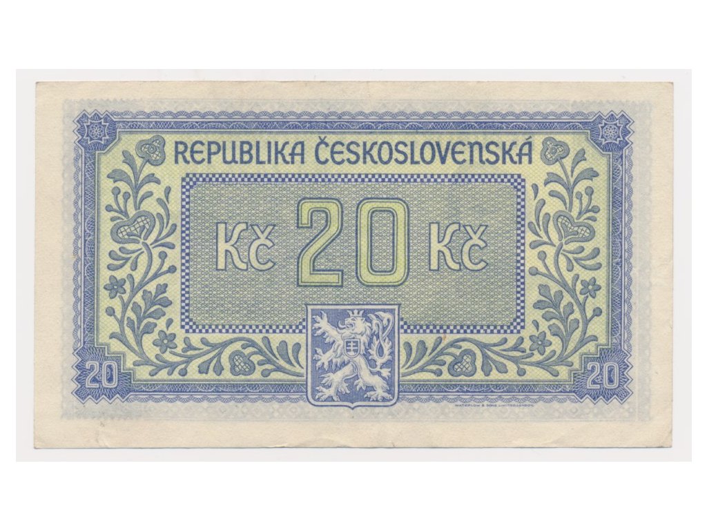 ČSR, 20 Kčs, bez data (1945), série KT, neperforovaná, slušný oběhový stav