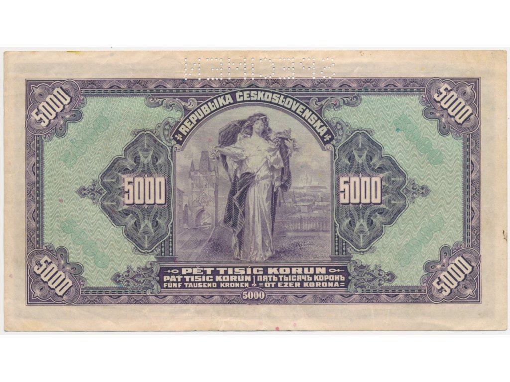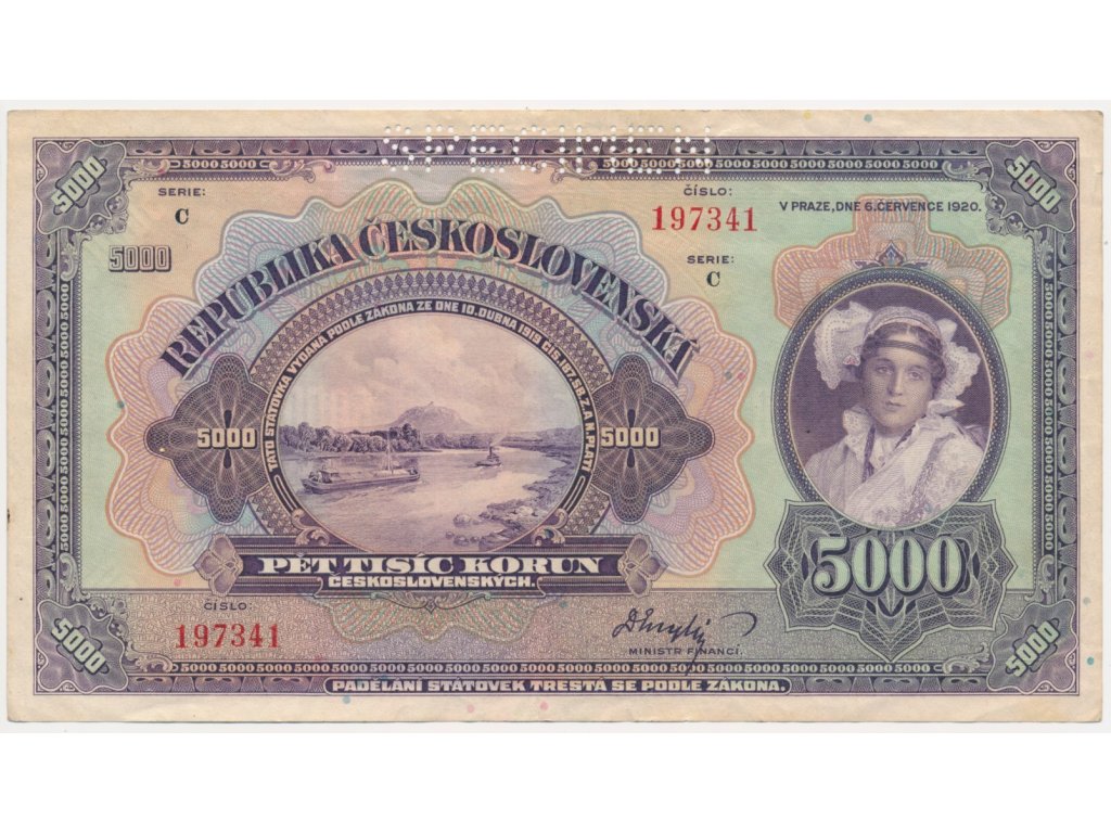 ČSR, 5000 Kč, 1920, série C, perforace SPECIMEN, stav 1...viz autentické foto