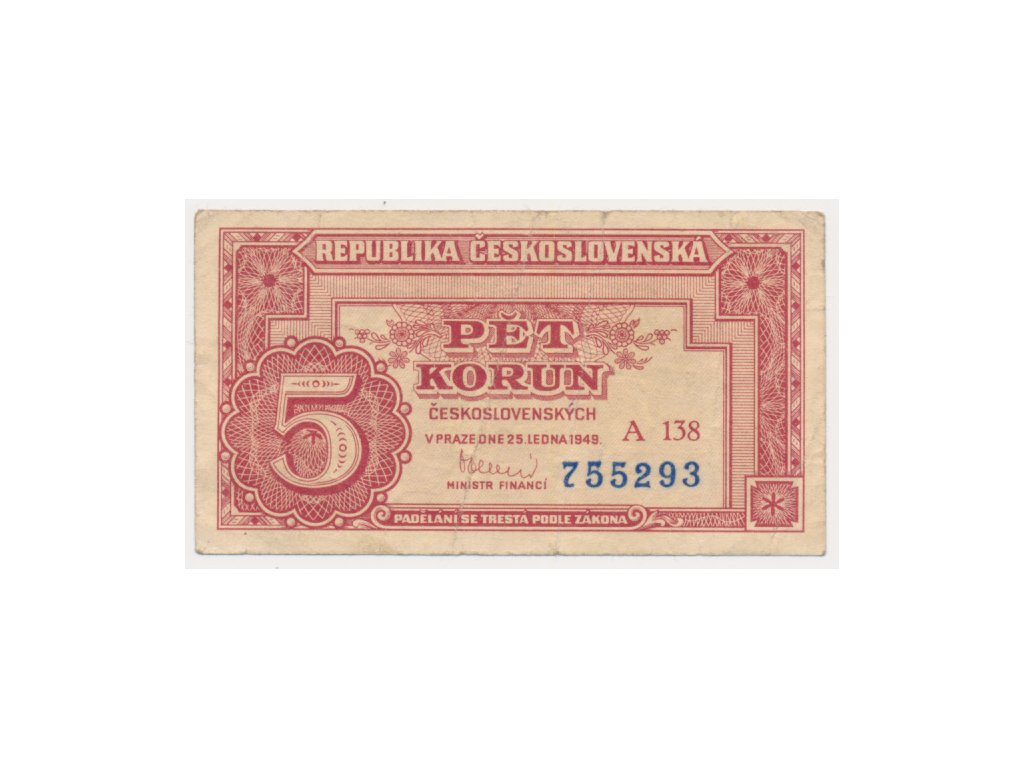ČSSR, 5 Kčs, 1949, série A 138, neperforovaná, oběhový stav