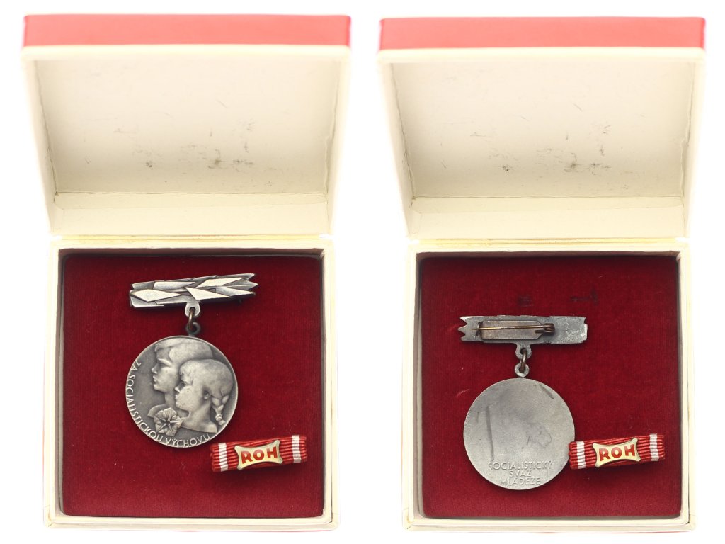ČSSR, AE medaile Za socialistickou výchovu, zavírací jehla, stužka, etue