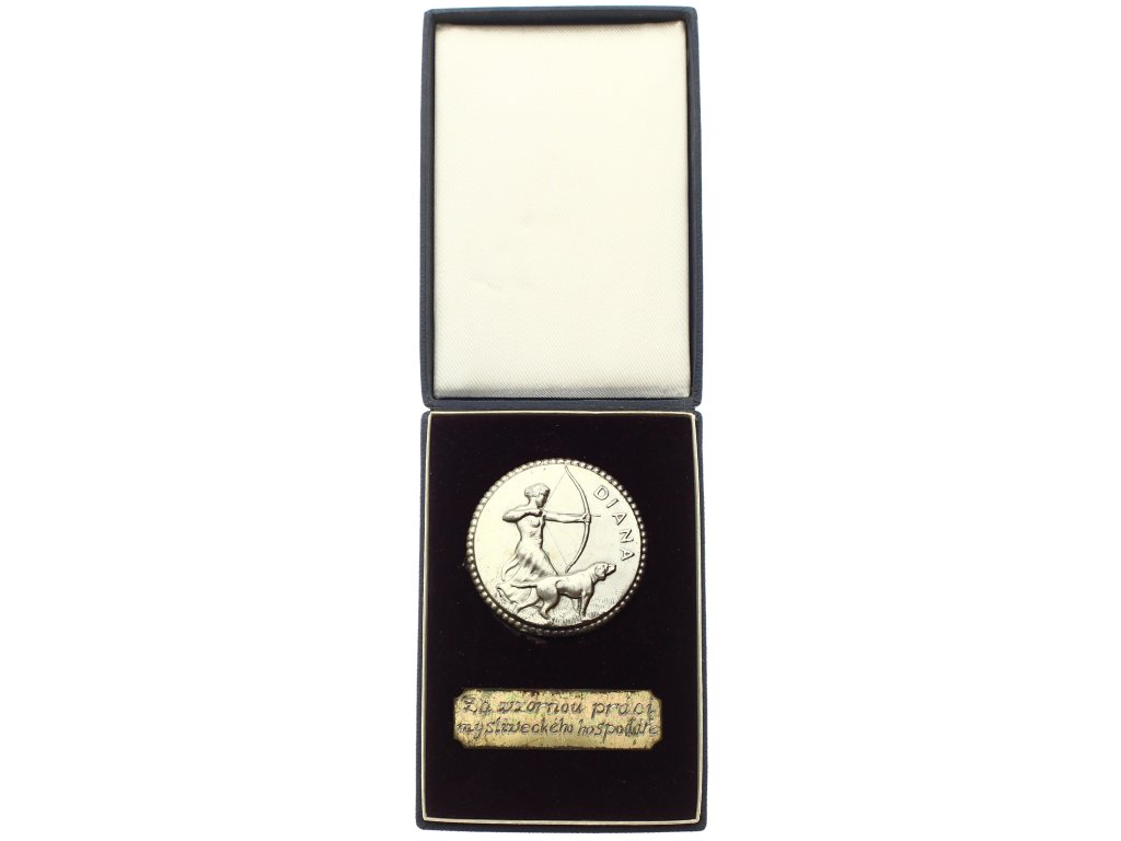 ČSSR, AE pamětní medaile Za vzornou práci mysliveckého hospodáře, cca 1975, průměr 55 mm, původní etue, postříbřeno, luxusní sběratelská jakost...viz autentické foto