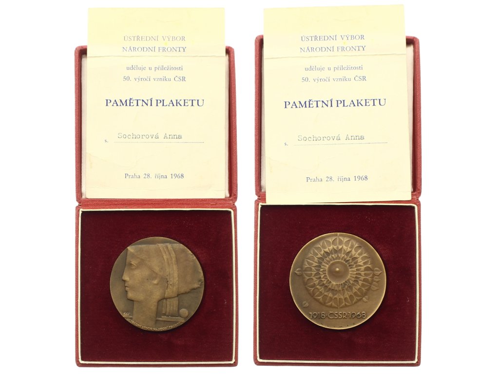 ČSSR, AE pamětní plaketa k 50. výročí vzniku republiky, 1968, průměr 50mm, etue, udělovací dekret, pěkná sběratelská jakost....viz autentické foto