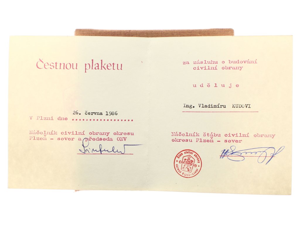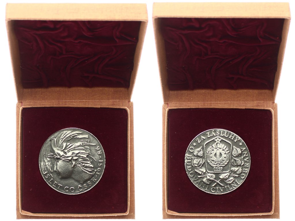ČSSR, AE plaketu Za zásluhy o civilní obranu, 1951/1986, průměr 70 mm, původní etue, udělovací dekret, luxusní sběratelská jakost...viz autentické foto