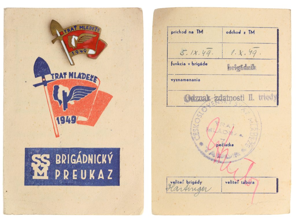 ČSSR, AE smaltovaný odznak Trať mládeže 1949 + Brigádnický průkaz, zavírací jehla, luxusní stavy...viz autentické foto...