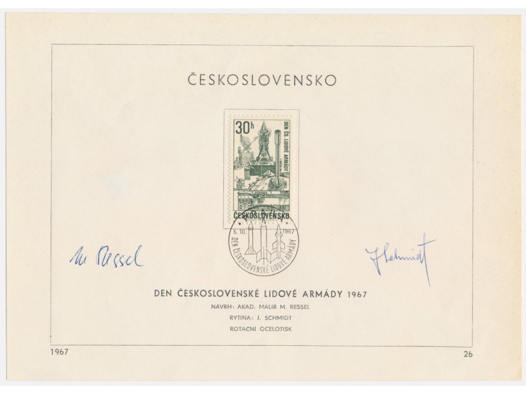 ČSSR, Příležitostná známka "Den Československé lidové armády", 1967, M. Ressel, J. Schmidt, originální podpisy autorů vylepených známek, rozměr listu cca 110x210 mm, na rubu stopa po nálepce či lepu, jinak krásný původní stav...viz autentické foto