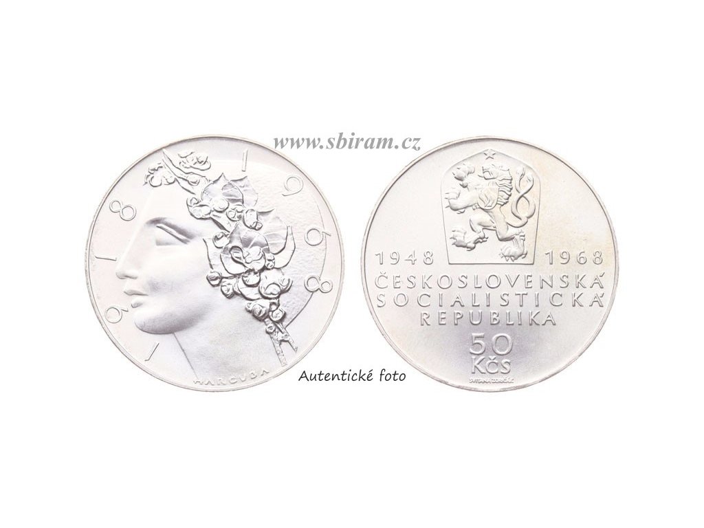 ČSSR, Ag (stříbrná) mince 50 Koruna 1968 - 50. výročí vzniku Československa a 20. výročí vítězství čs. pracujícího lidu, jemná patina, stav -0/0-...viz autentické foto