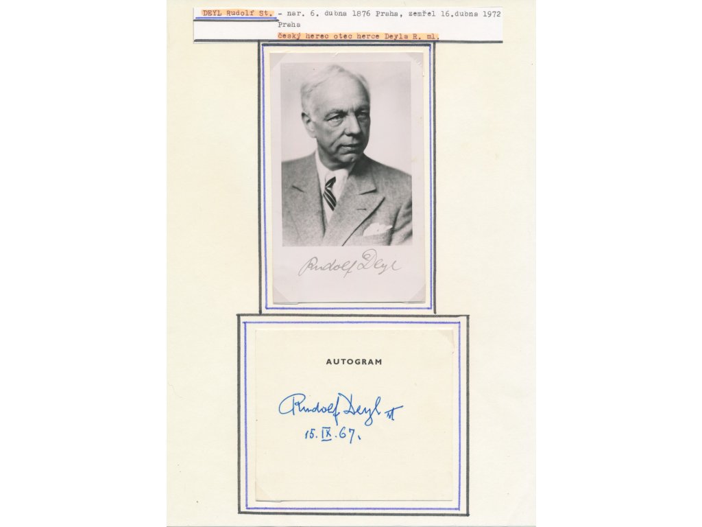 Deyl Rudolf st. (1876-1972), český herec, sběratelský list o velikosti A4 s portrétovou fotografií (foto V.J.Krýsa) s vlastnoručním podpisem a sběratelskou kartičkou s vlastnoručním podpisem, datováno 1967...viz autentické foto
