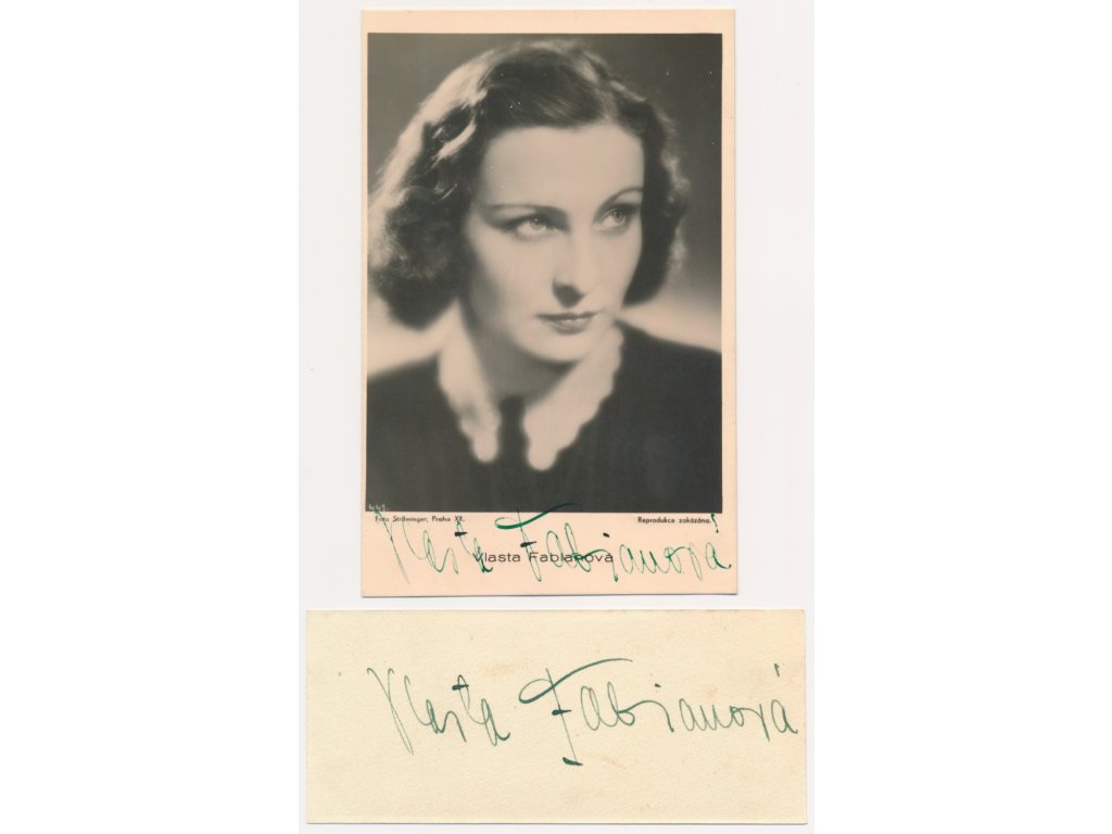 Fabiánová Vlasta (1912-1991), česká herečka, portrétová pohlednice (foto Ströminger) o rozměrech cca 9x14cm s vlastnoručním podpisem a sběratelská kartička s vlastnoručním podpisem...viz autentické foto
