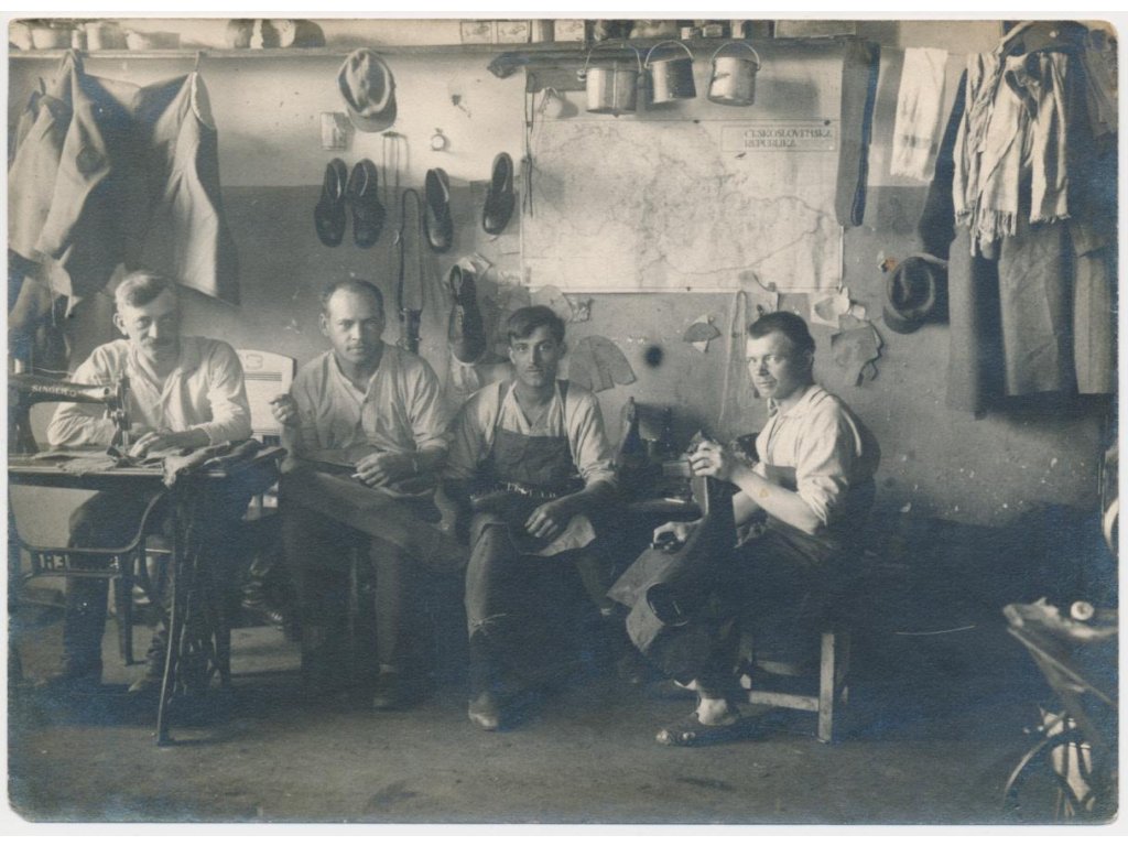 Fotografie ze ševcovské dílny, pracující ševci....