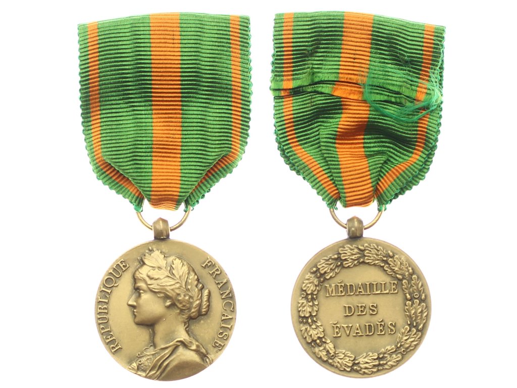 Francie, AE Medaile pro uprchlíky (Médaille des Évadés), jde o vojenské vyznamenání, které bylo udělováno osobám, které úspěšně unikly ze zajetí, nebo zemřely při pokusu o útěk ve všech válkách od roku 1870, stuha, stav 1/1/1...viz autentické foto