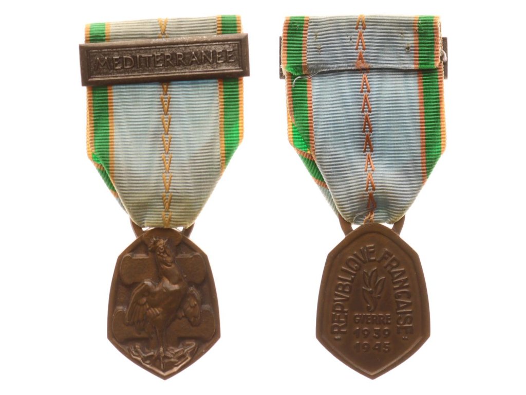Francie, AE Válečná pamětní medaile 1939–1945 (Médaille commémorative française de la guerre 1939–1945), štítek MÉDITERRANÉE (Středomoří), bronz, stuha, stav 1/1/1...viz autentické foto
