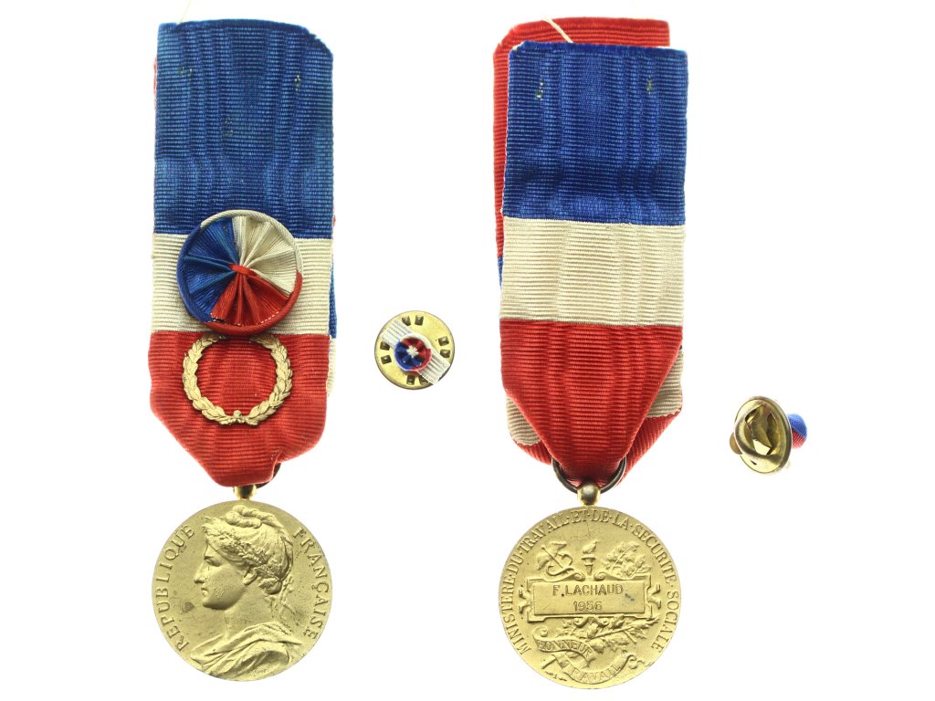 Francie, Čestná medaile práce, 1956, pozlacené stříbro, stuha, rozeta + miniatura, stav 1/1/1...viz autentické foto