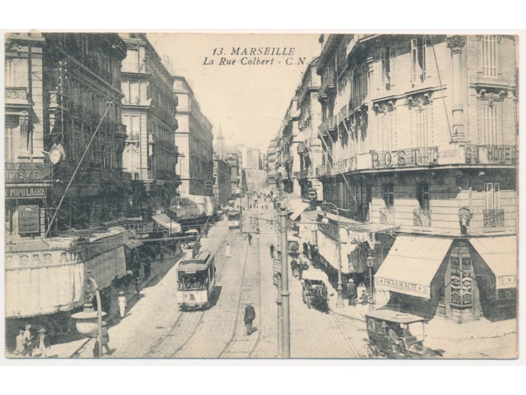 Francie, Marseille, Le Rue Colbert, tramvaj, oživená ulice, cca 1913